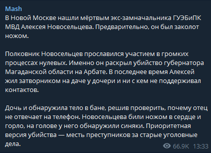 В России, в Новой Москве, убили бывшего заместителя начальника Главного управления по борьбе с экономическими преступлениями МВД РФ Алексея Новосельцева. По предварительным данным, его зарезали. Правоохранители проверяют версию убийства в связи со старыми делами Новосельцева.