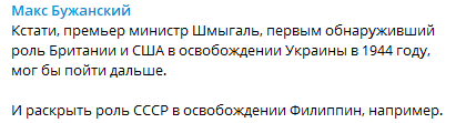 Народный депутат от партии "Слуга народа" Максим Бужанский написал у себя в Telegram, что "премьер-министр Шмыгаль, первым обнаруживший роль Британии и США в освобождении Украины в 1944 году, мог бы пойти дальше. И раскрыть роль СССР в освобождении Филиппин, например".