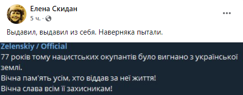 "Выдавил, выдавил из себя. Наверняка пытали", - прокомментировала поздравления Зеленского Елена Скидан у себя в Facebook.