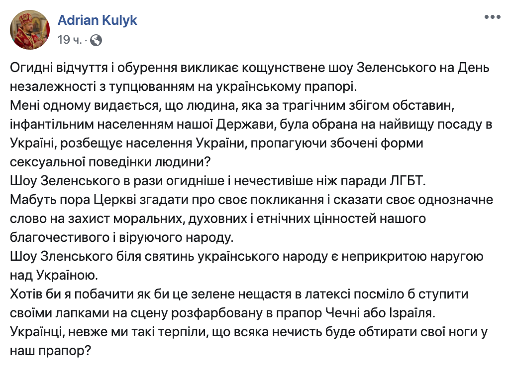 Это он так высказывался по поводу концерта ко Дню независимости в 2020 году. "Шоу Зеленского в разы отвратительнее и нечестивее, чем парады ЛГБТ", - писал он в Facebook.