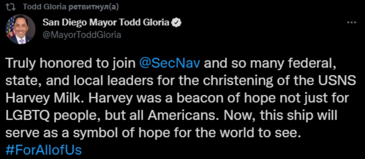 "Для меня большая честь быть вместе с министром ВМС (Карлосом дель Торо) и таким большим числом чиновников штата, федерального и местного уровня для наречения судна USNS Harvey Milk. Харви был лучом надежды не только для представителей ЛГБТК, но и для всех американцев. Теперь этот корабль станет символом надежды для всего мира", - написал в Твиттере мэр города Тодд Глория.