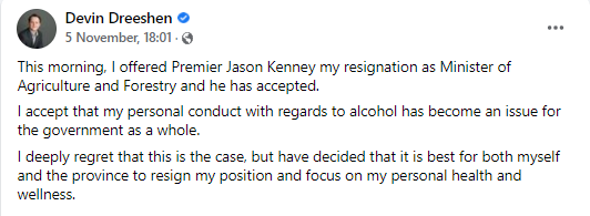 В Канаде министр лесной промышленности и сельского хозяйства провинции Альберта Девин Дришен ушел в отставку после обвинений в распитии алкоголя в своем рабочем кабинете. Впервые о пьянстве Дришена стало известно 10 дней назад после того, как его бывшая подчиненная подала иск в суд, в котором описывалась "отравленная рабочая атмосфера".