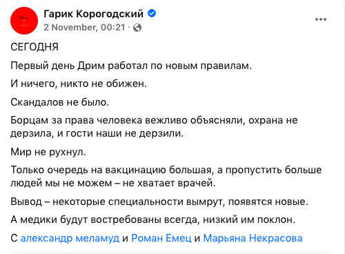 "Перый день Дрим работал по новым правилам. И ничего, никто не обижен. Скандалов не было. Борцам за права человека вежливо объяснили, охрана не дерзила, и наши гости не дерзили. Мир не рухнул..." - написал Корогодский в фейсбуке.
