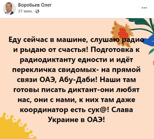 "Еду сейчас в машине, слушаю радио и рыдаю от счастья! Подготовка к радиодиктанту едности, и идет перекличка свидомых - на прямой связи ОАЭ, Абу-Даби! Наши там готовы писать диктант - они любят нас, они с нами, к ним там даже координатор есть сук@! Слава Украине в ОАЭ!", - написал Олег Воробьев.