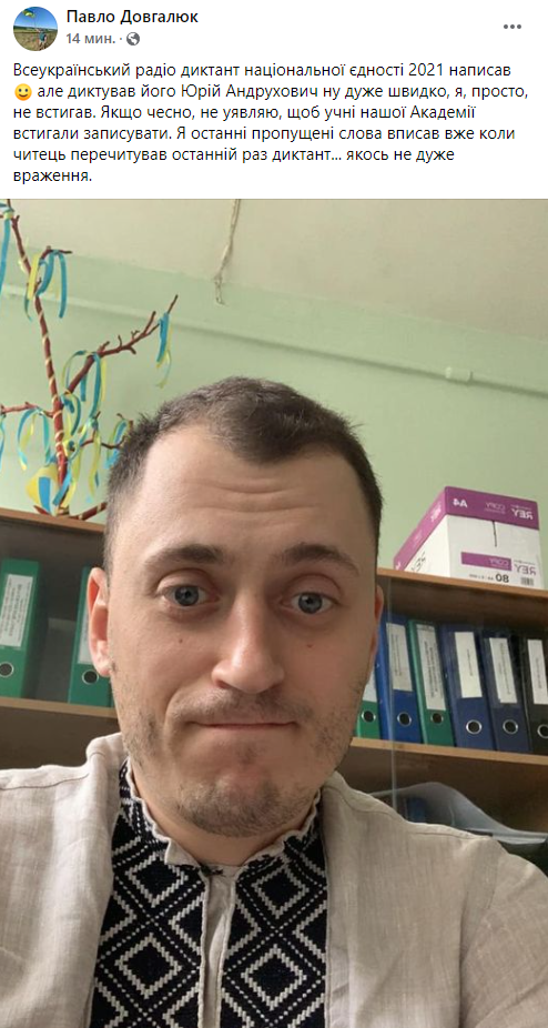 Интересно, что президент Зеленский отказался участвовать в радиодиктанте национального единства, сославшись на другие планы. Зато участвовал глава Нацпамяти Антон Дробович, который впервые со времен школы сел за написание диктанта.