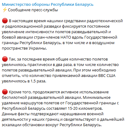 "В настоящее время нашими средствами радиотехнической и радиолокационной разведки фиксируется постоянное увеличение интенсивности полетов разведывательной и боевой авиации стран-членов НАТО вдоль государственной границы Республики Беларусь, в том числе и в воздушном пространстве Украины", – говорится в сообщении.