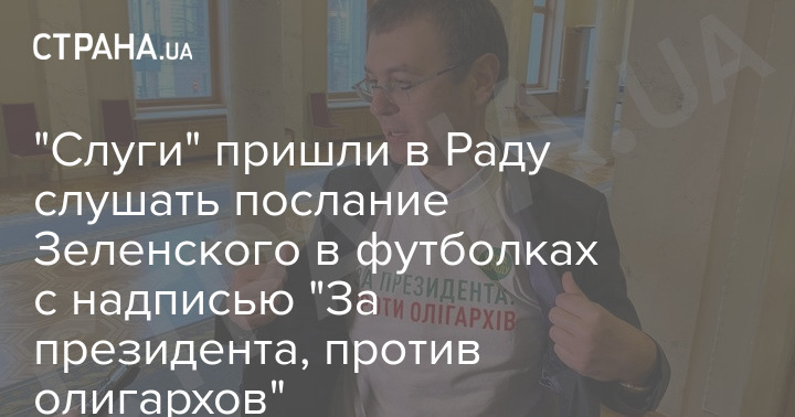 В среду, 1 декабря, в день выступления президента Украины Владимира Зеленского в Верховной Раде, некоторые депутаты фракции "Слуга народа", как и анонсировала "Страна", пришли в футболках с надписью "За президента, против олигархов".