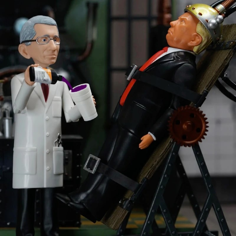 Фигурка доктора Фаучи одета в белое пальто и съемную маску. У куклы есть фирменные очки доктора, а в переднем кармане можно носить стетоскоп.