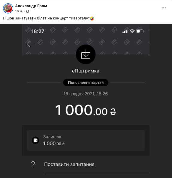 Активист Александр Гром опубликовал скриншот о перечислении 1000 гривен и написал, что "пошел заказывать билет на концерт "Квартала".