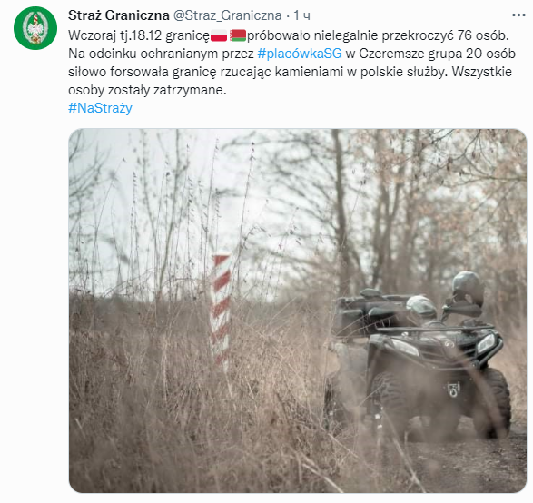 "Вчера 76 человек пытались нелегально перейти границу. На участке возле Черемхи группа из 20 человек силой форсировала границу, бросая камни в польские службы. Все люди задержаны", - говорится в сообщении.