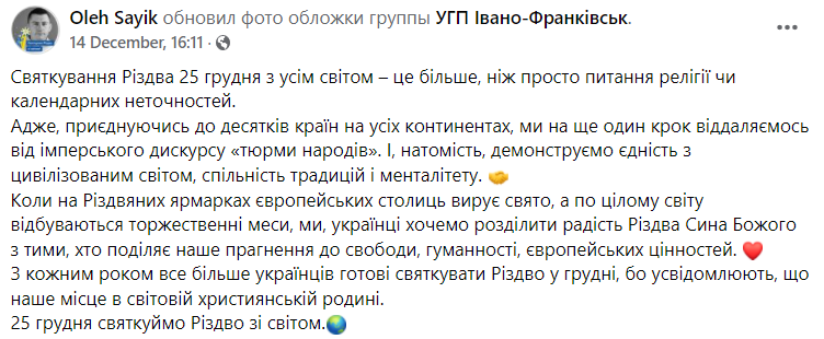Глава ивано-франковского подразделения "Галицкой партии" Олег Саик рассуждает, что перенос Рождества - вопрос не религиозный и не календарный. А средство отделения от России.