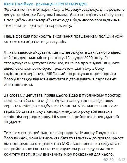 "Фракция политической партии "Слуга Народа" осуждает действия народного депутата Николая Галушки и считает его поведение в общении с полицейскими неприемлемым для любого гражданина. Тем более – для члена парламента. Наша фракция приносит извинения работникам полиции и всем, кого могла оскорбить эта ситуация", - говорится в сообщении.