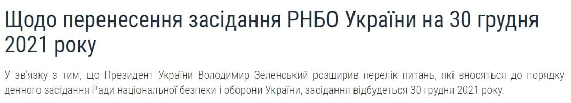"В связи с тем, что президент Украины Владимир Зеленский расширил перечень вопросов, которые вносятся в повестку заседания Совета национальной безопасности и обороны Украины, заседание состоится 30 декабря 2021 года", - говорится в сообщении.