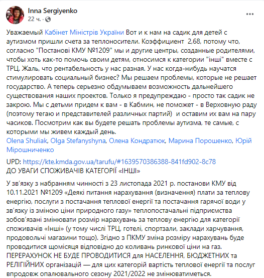 "Уважаемый Кабинет Министров, вот и к нам в садик для детей с аутизмом пришли счета за теплоносители. Коэффициент 2,68, потому что, согласно постановлению КМУ №1 209, мы и другие центры, созданные родителями, чтобы хоть как-то помочь своим детям, относимся к категории "інші" вместе с ТРЦ. Жаль, что рентабельность у нас разная", - говорится в сообщении.