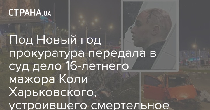 Харьковская областная прокуратура передала в суд обвинительный акт против 16-летнего мажора Николая Харьковского, который стал виновником смертельного ДТП. Уголовное дело было открыто по фактам нарушения правил безопасности дорожного движения, повлекшего смерть потерпевшего, и заведомо ложного сообщения о совершении преступления (ч. 2 ст. 286, ч. 1 ст. 383 УК Украины).
