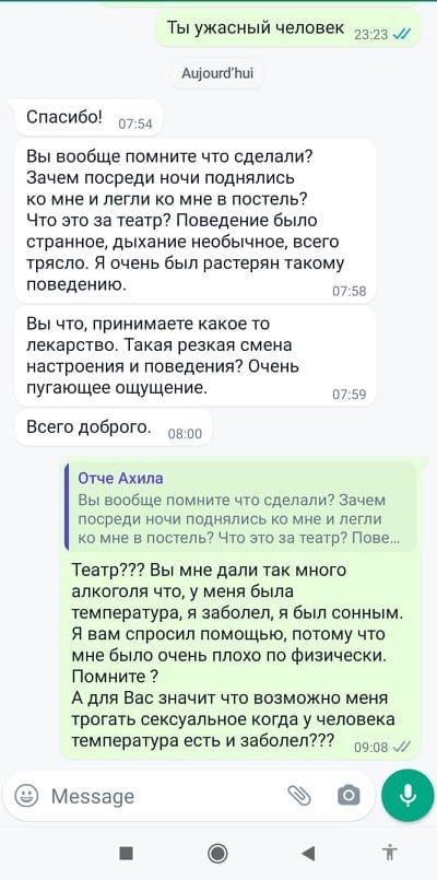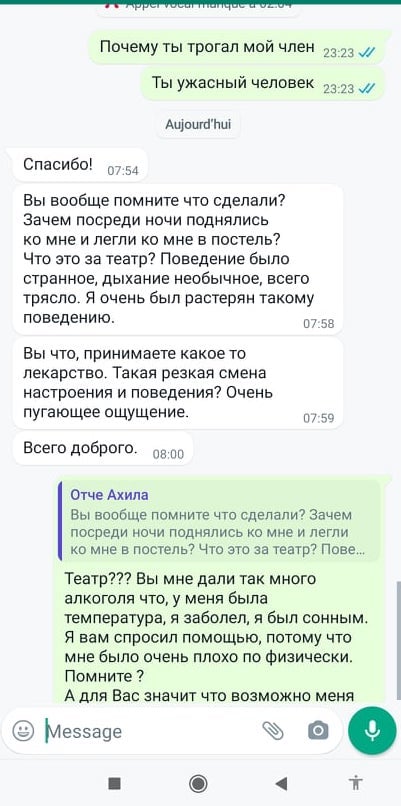 Как бы в подтверждение своих слов француз выложил переписку со священником, которая, впрочем, его обвинения не подтверждает, а опровергает. Из нее следует, что он сам внезапно попытался лечь в постель к священнику, что похоже на явную провокацию. Об изнасиловании в переписке речи и вовсе не идет.