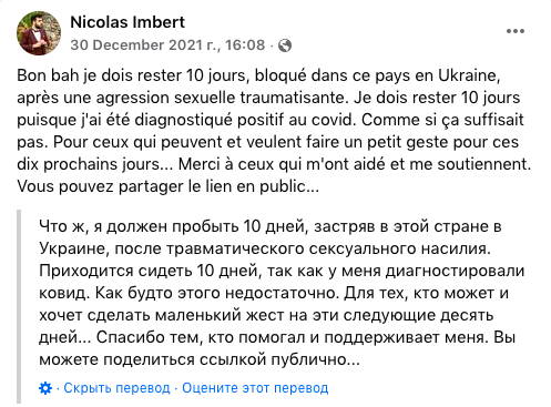 Но в итоге, не дожидаясь окончания изоляции (если, конечно, он на самом деле заболел коронавирусом), аспирант отправился во Францию, откуда заявил, что написал заявление в полицию и посольство по факту изнасилования. О своей истории Имберт также сообщил в группе на Facebook украинской диаспоры в США. Правда, там он не нашел поддержки и понимания.