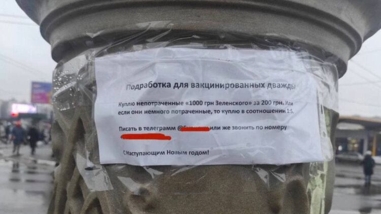 "Куплю непотраченные "1000 грн Зеленского" за 200 грн. Или если они немного потрачены куплю в соотношении 1:5", - говорится в сообщении.