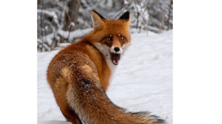 На фотографии можно заметить дикую лисицу, чья поза выражает и испуг, и агрессию одновременно. Что напугало или разозлило рыжую хищницу - осталось за кадром.