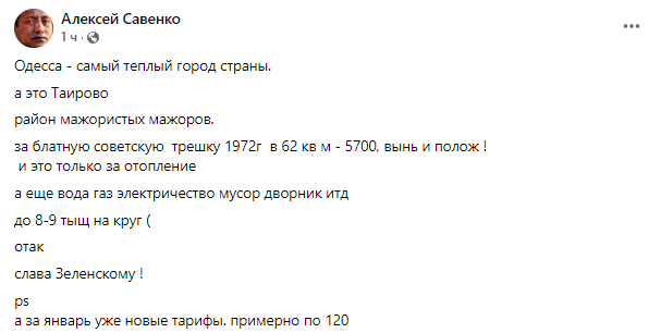 "Одесса - самый теплый город страны. А это Таирово район мажористых мажоров. За блатную советскую трешку 1972г в 62 кв м - 5700, вынь и полож! И это только за отопление, а еще вода газ электричество мусор дворник и т.д. до 8-9 тыщ на круг", - говорится в подписи к фото с объявлением.