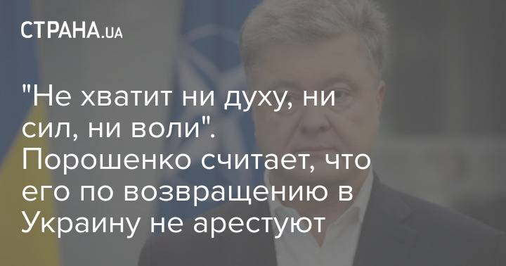 Бывший президент Украины Петр Порошенко считает, что его по возвращению в Украину не арестуют. По его мнению, для этого власти не хватит "ни духу ни сил, ни воли".