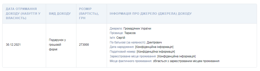 Согласно этим данным, 30 декабря депутат получил в подарок от 273 000 гривен. Денежный сюрприз нардепу сделал Сергей Тарасов. Отметим, что отчество депутата - Сергеевич, и их фамилии совпадают.
