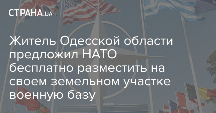 Житель Одесской области Демьян Ганул написал письмо генеральному секретарю НАТО Йенсу Столтенбергу и предложил Североатлантическому Альянсу разместить на своем земельном участке военную базу. Он выразил готовность передать НАТО 5,3 гектара земли в бесплатное пожизненное пользование.