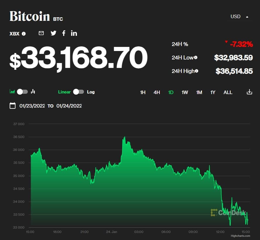 Напомним, в субботу, 22 января, стало известно, что в течение суток курс биткоина рухнул на 9% и обновил минимум с июля 2021 года