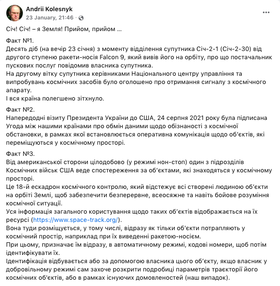 23 января бывший советник главы Государственного космического агентства Украины Андрей Колесник написал в Facebook, что по прошествии десяти дней после запуска "Сич" до сих пор не вышел на связь.