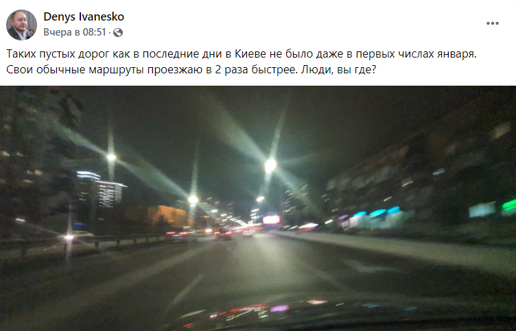 "Таких пустых дорог как в последние дни в Киеве не было даже в первых числах января. Свои обычные маршруты проезжаю в 2 раза быстрее. Люди, вы где?", - написал вчера утром журналист Денис Иванеско.