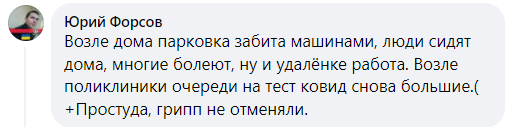 "Школы на дистанционке, наш лицей учится, но по 6 человек в классе, машины соседей под домами, люди просто дома сидят", "Много школ/классов на дистанционном обучении", "Возле дома парковка забита машинами, люди сидят дома, многие болеют, ну и на удаленке работа. Возле поликлиники очереди на тест ковид снова большие. Плюс простуду и грипп не отменяли", - пишут пользователи.