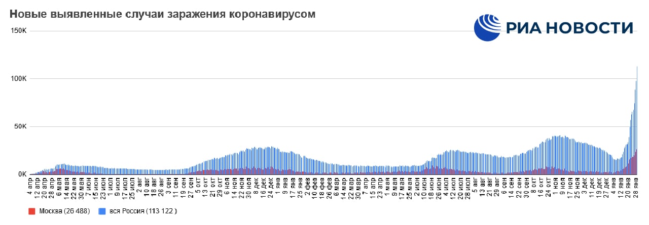 Вслед за сообщением о рекордном числе заболевших коронавирусом в Украине, о новом коронавирусном рекорде сообщили и в РФ. За прошедшие сутки в России количество зараженных коронавирусом возросло на 113 122 человека. Это абсолютный рекорд заболеваемости за все время пандемии.