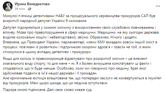 "Если для некоторых правоохранителей сообщать об открытом преступлении - элемент соревновательного спорта, то для меня это не так. С болью вынуждена констатировать эти факты и надеюсь, что их станет меньше. Особенно, когда речь идет о человеке, чей брат совершал подвиг во имя нашего государства и его граждан. Но уголовная юстиция устроена так, что предыдущие заслуги не конвертируются в иммунитет от прокуроров. Мне искренне жаль, что этот человек ушел в отставку. Я подписала подозрение. Далее своё слово должен сказать суд", - написала Ирина.