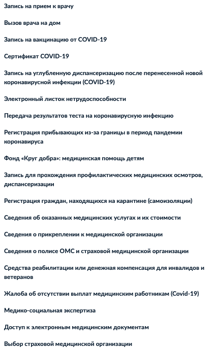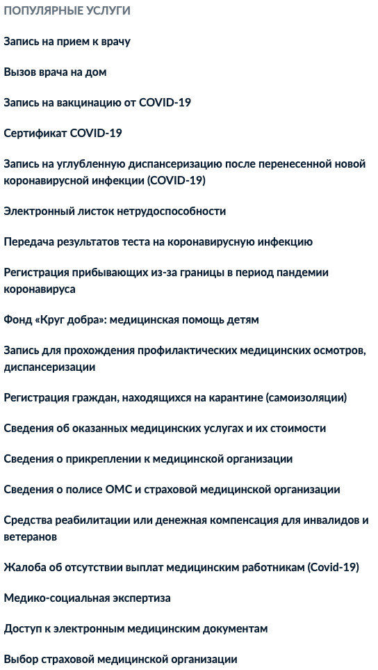 Самыми популярным в 2021 году были (в порядке убывания): запись на прием к врачу, выписка о состоянии индивидуального лицевого счета, выплаты на детей, запись в детский сад, регистрация транспортного средства.