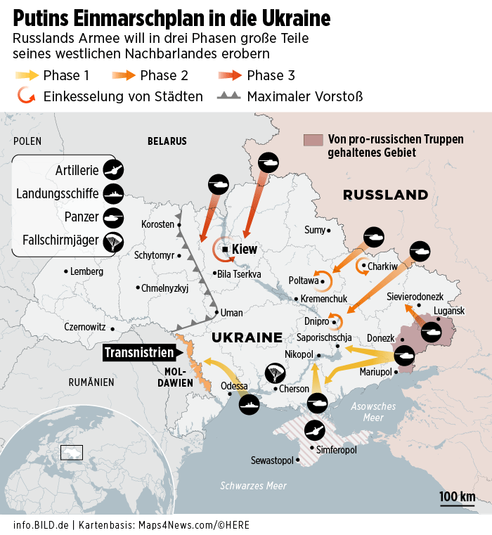 "Поскольку Генеральный штаб Минообороны Российской Федерации все никак не разработает план военного вторжения в Украину, германский таблоид Bild опубликовал свой план. Это правильно. Потому что, например, вздумает Путин напасть на Украину и что ему делать без плана? А теперь есть хоть какой-то", - иронизирует журналист Владимир Бойко.
