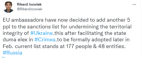 "Послы Евросоюза приняли решение внести в санкционный список еще 5 человек за подрыв территориальной целостности Украины. Это связано с содействием выборам в Государственную думу, которые прошли в Крыму", - написал журналист.