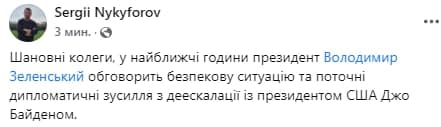 "Уважаемые коллеги, в ближайшие часы президент Владимир Зеленский обсудит ситуацию с безопасностью и текущие дипломатические усилия по деэскалации с президентом США Джо Байденом", - написал Никифоров.