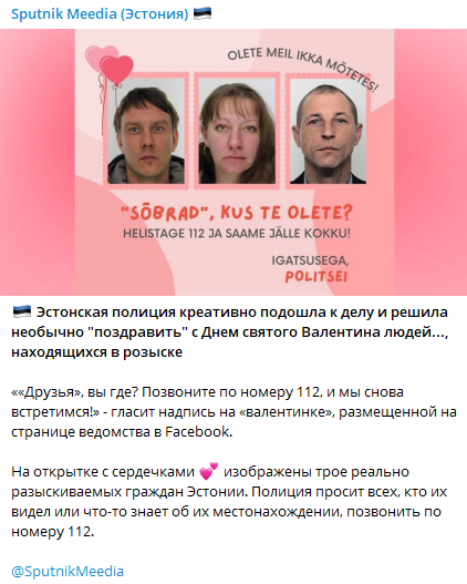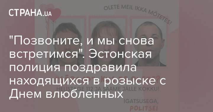 "Позвоните, и мы снова встретимся". Эстонская полиция поздравила находящихся в розыске с Днем влюбленных