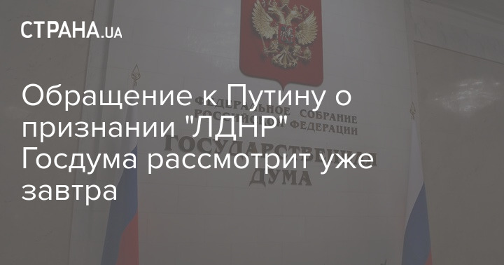 Завтра, 15 февраля, Государственная Дума РФ рассмотрит вопрос обращения к президенту России Владимиру Путину о необходимости признания "ДНР" и "ЛНР".