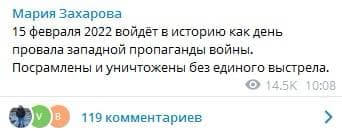 "15 февраля 2022 войдёт в историю как день провала западной пропаганды войны. Посрамлены и уничтожены без единого выстрела", - заявила Мария Захарова.