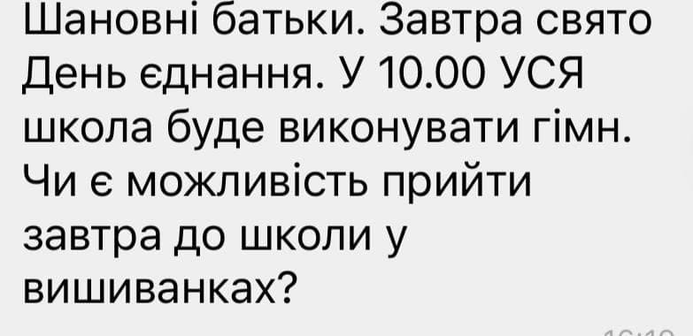 "Уважаемые родители. Завтра праздник День единства. В 10.00 ВСЯ школа будет исполнять гимн. Есть ли возможность прийти в школу в вышиванках?"