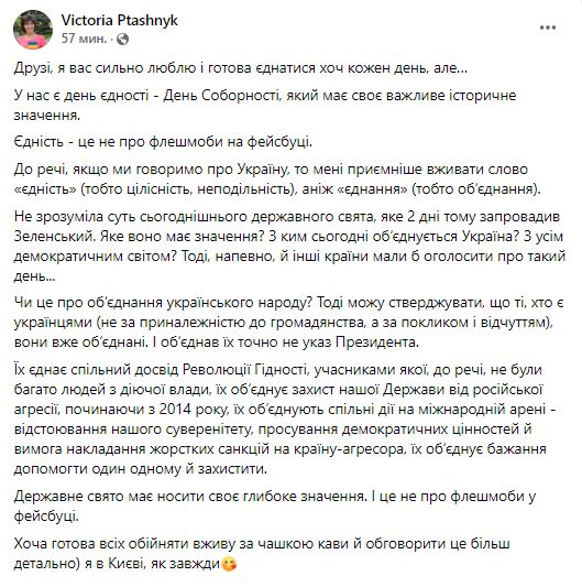 "Не понятна суть сегодняшнего государственного праздника, который два дня назад ввел Зеленский. Какое оно имеет значение? С кем сегодня объединяется Украина? Со всем демократическим миром? Тогда, наверное, и другие страны должны объявить о таком дне", - написала экс-депутат Виктория Пташник.