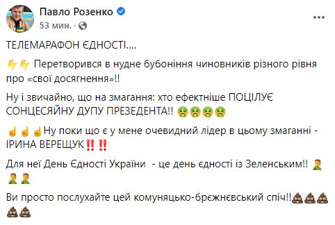 "Телемарафон единства превратился в скучное бубнение чиновников разного уровня о "своих достижениях"", - выразил мнение экс-министр Павел Розенко.