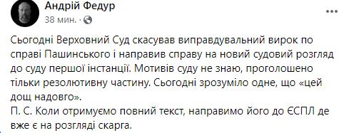 "Сегодня Верховный Суд отменил оправдательный приговор по делу Пашинского и направил дело на новое судебное разбирательство в суд первой инстанции. Мотивов суда не знаю, провозглашена только резолютивная часть" - написал он и добавил, что когда будет получен полный текст, то его направят в ЕСПЧ, где уже есть на рассмотрении жалоба.