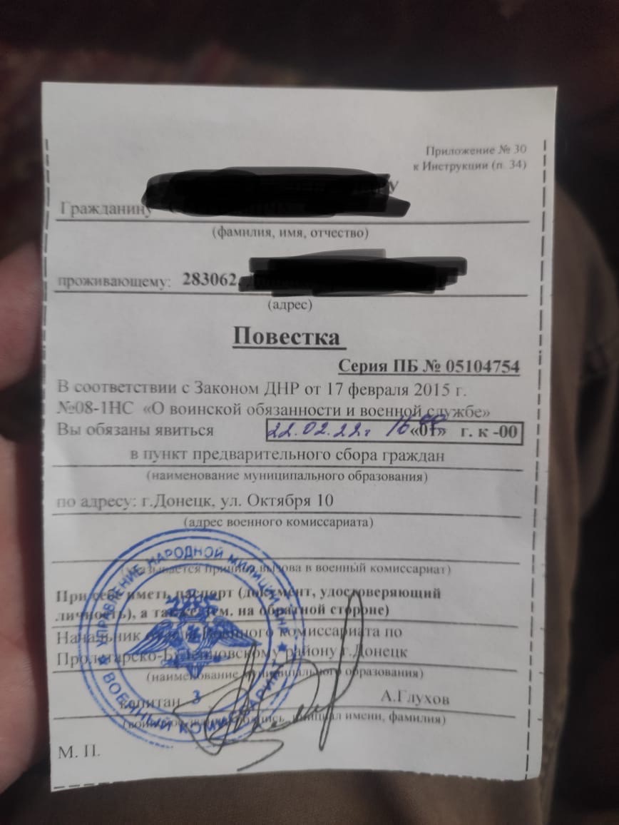 После получения паспорта "ДНР" или "ЛНР", мужчинам выдавали направление в военкомат - стать на учет по месту прописки. Но поскольку это происходило уже после выдачи документа на руки, многие этого делать не торопились. Тем более что "паспорт" был действителен и так.