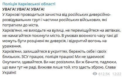 Харьковчане, оставайтесь в укрытиях, берегите себя и своих близких. ВСУ работает, полиция работает! Мы не сдаемся!