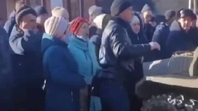 На видео, которое опубликовали в ТикТоке, видно, как десятки людей блокируют продвижение танков РФ.