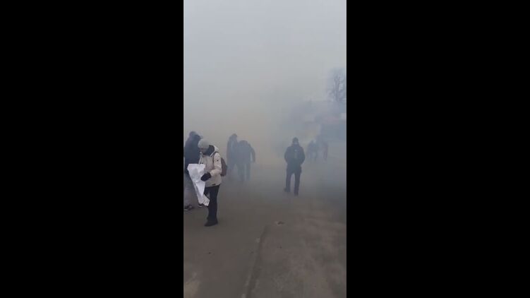 На видео слышны взрывы, также заметно, что против собравшихся применяют слезоточивый газ. У некоторых людей с собой флаги Украины.