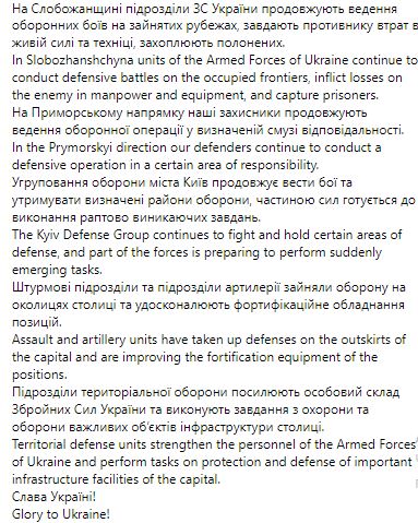 Вечером 1 марта Генштаб ВСУ дал сводку о ситуации по российскому вторжению.