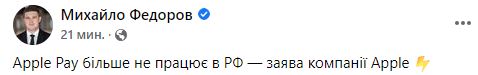 Ранее министр цифровой трансформации Украины Михаил Федоров обратился к главе компании Apple Тиму Куку и попросил отключить россиян от App Store.